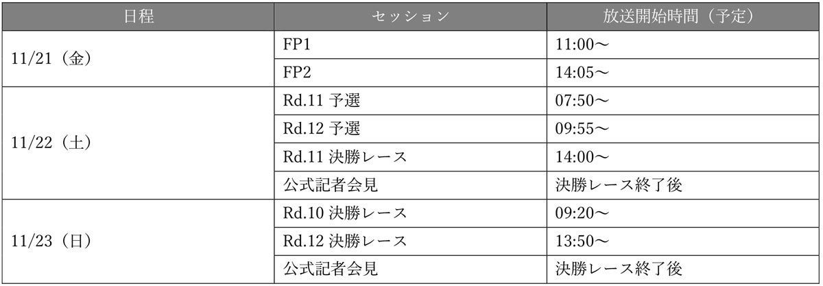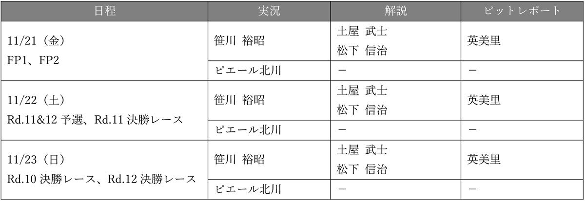 国内最⾼峰で最速の⾃動⾞レースシリーズである全⽇本スーパーフォーミュラ選⼿権(以下「SUPER FORMULA」)を運営する株式会社⽇本レースプロモーション(以下「JRP」)は、11⽉21⽇(⾦)・22⽇(⼟)・23⽇(⽇)の3⽇間、鈴⿅サーキット(三重県鈴⿅市)で開催される「瑶⼦⼥王杯 2025年 全⽇本スーパーフォーミュラ選⼿権 第10戦・第11戦・第12戦 第24回JAF鈴⿅グランプリ」の放送予定および公式放送の出演者を発表しました。