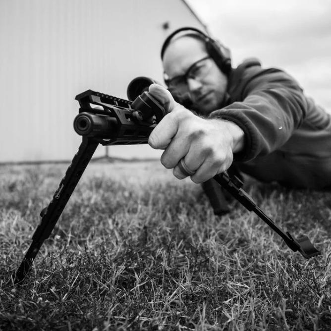 滑りにくいグリップフットと強靭な6061アルミニウム構造が、地形を選ばない射撃安定性を提供。