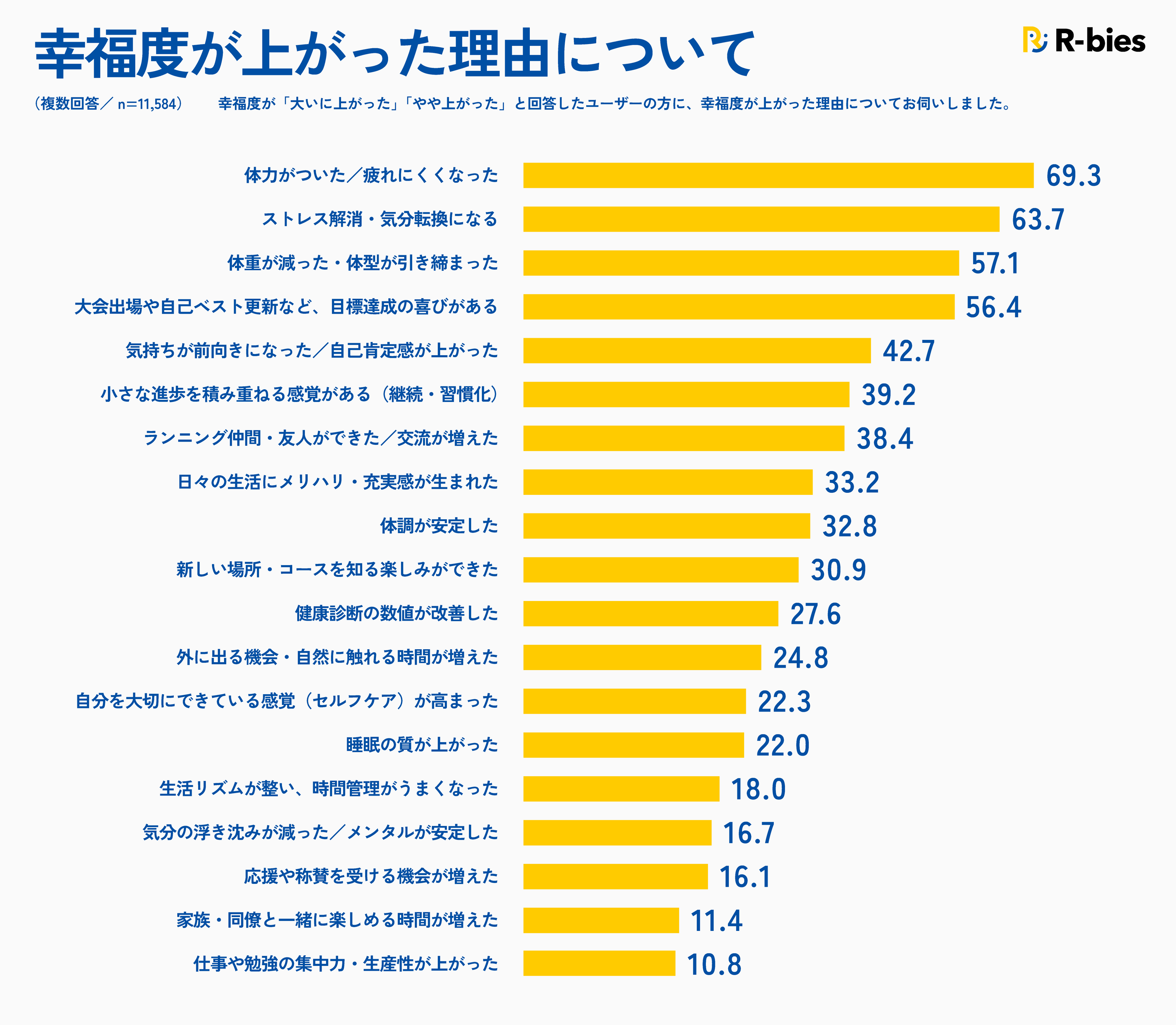 幸福度が上がった理由(複数回答)として、上位3位までは、体力向上やストレス解消といったフィジカル面の効果が占める一方で、メンタルに関する効果も4割以上を挙げています。