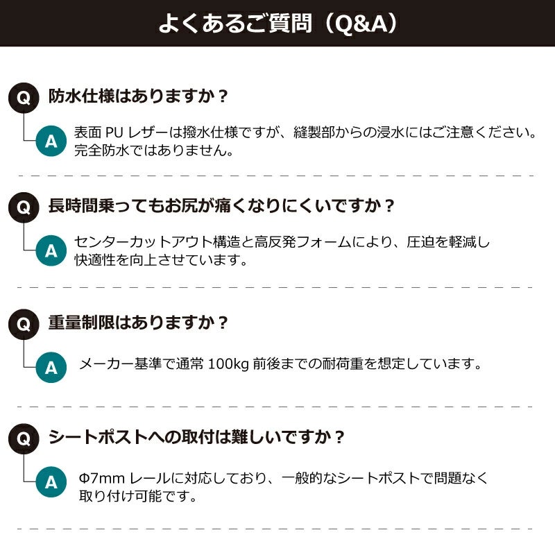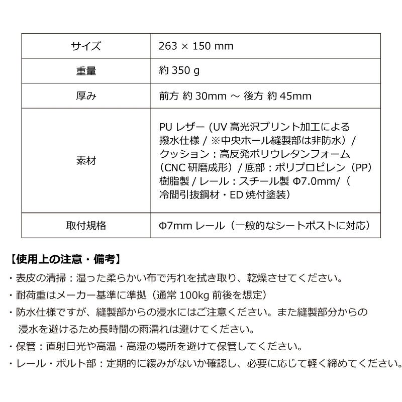 PUレザー (UV高光沢プリント加工による撥水仕様 / ※中央ホール縫製部は非防水)/クッション:高反発ポリウレタンフォーム(CNC研磨成形)/底部:ポリプロピレン(PP)樹脂製/レール:スチール製 Φ7.0mm/(冷間引抜鋼材・ED焼付塗装・ポジション調整メモリ付)