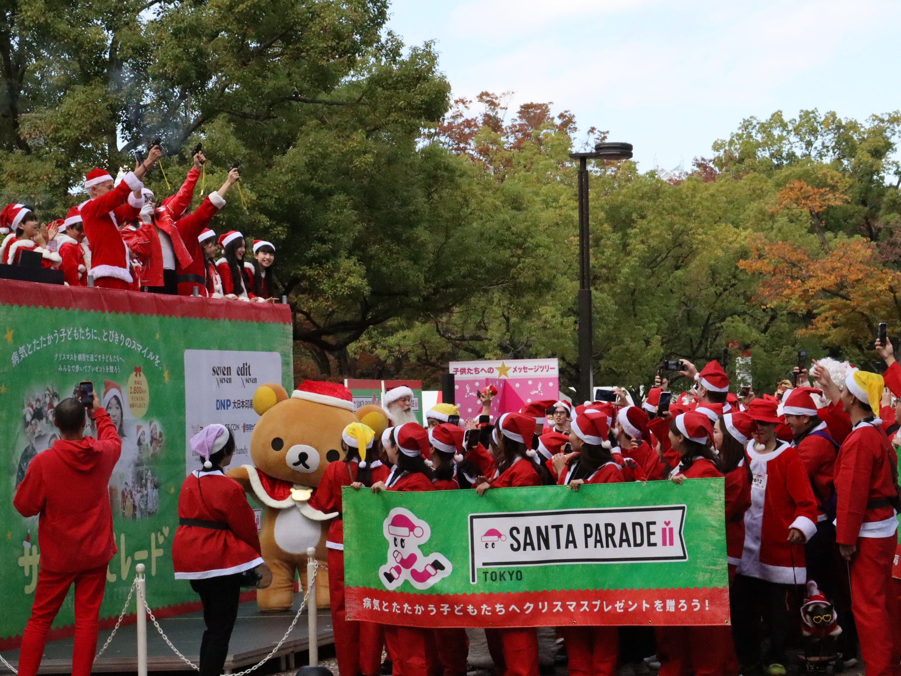 7回目を迎える「サンタパレード東京」では今回、原宿駅から渋谷駅までの公道2.5kmをパレード形式で、病気と闘う子どもたちに想いを寄せながら、そして、クリスマス色に染まる街の景色を楽しみながら、サンタクロース姿でゆっくりとウォーキングします。1組目スタートのタイミングに、スタートラインに登場したリラックマは、参加者の方と和気あいあいとふれあい、パレードの開始を盛り上げました。