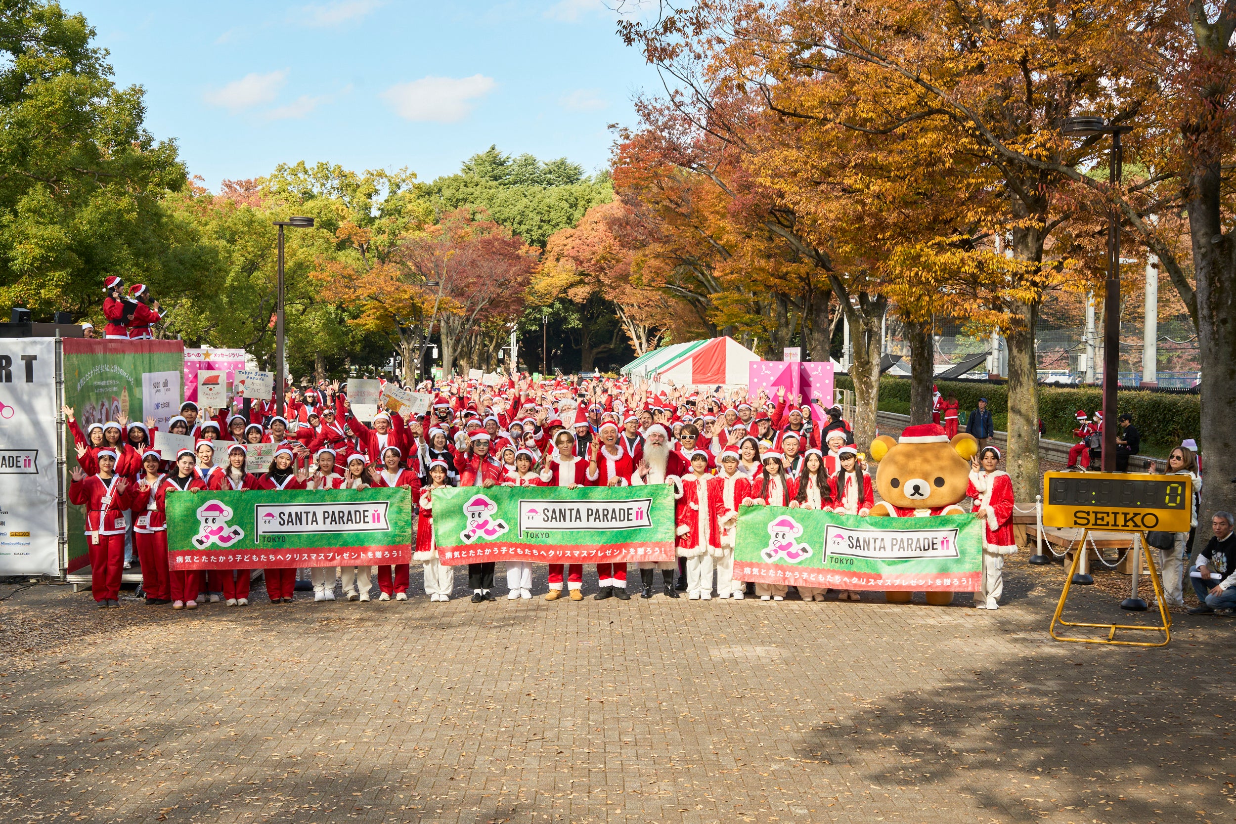 7回目を迎える「サンタパレード東京」では今回、原宿駅から渋谷駅までの公道2.5kmをパレード形式で、病気と闘う子どもたちに想いを寄せながら、そして、クリスマス色に染まる街の景色を楽しみながら、サンタクロース姿でゆっくりとウォーキングします。1組目スタートのタイミングに、スタートラインに登場したリラックマは、参加者の方と和気あいあいとふれあい、パレードの開始を盛り上げました。
