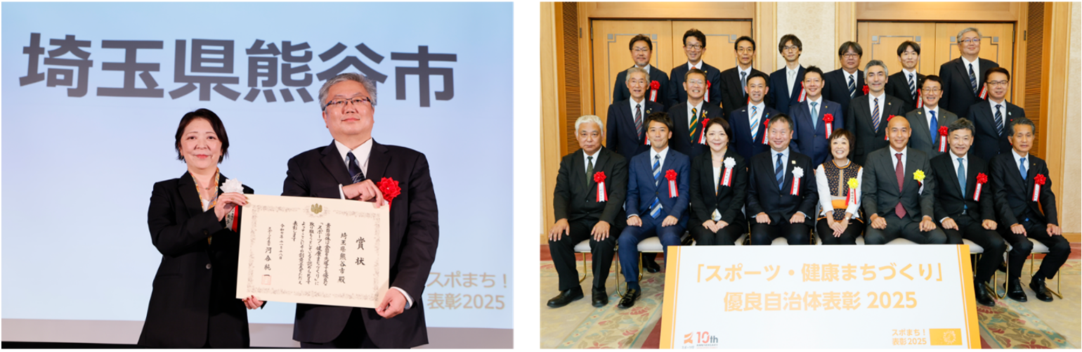 この度、本共同研究の運営主体である熊谷市は、スポーツ庁が主催する「スポーツ・健康まちづくり優良自治体表彰(スポまち!表彰)2025」を受賞しました。これは、スポーツ庁が2021年に創設した制度で、スポーツを活用したまちづくりに積極的に取り組む自治体を応援し、各自治体のアイデアの中から優良自治体を審査・選出して表彰するものです。