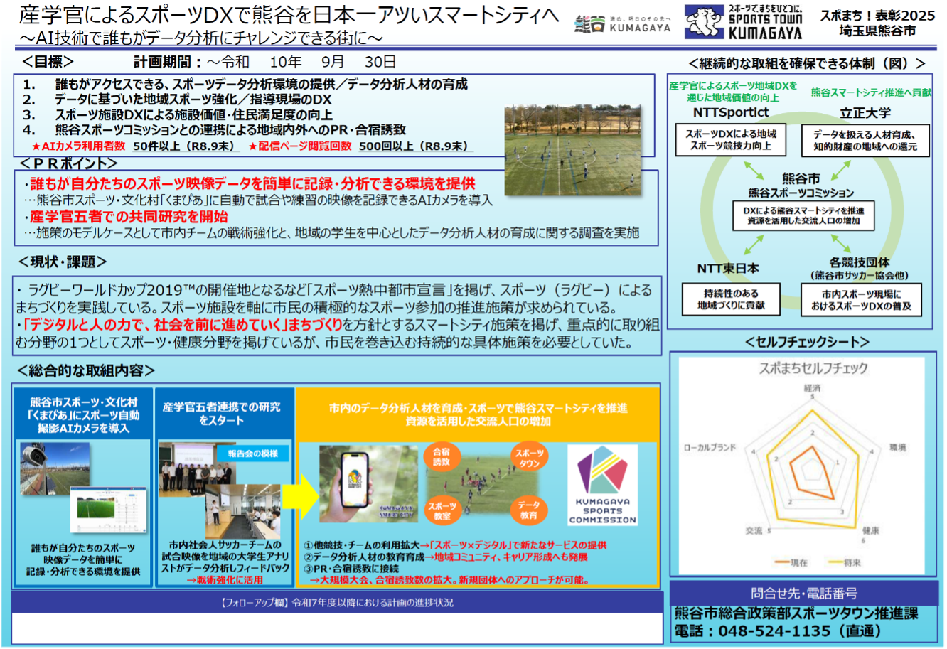 埼玉県熊谷市(市長:小林 哲也、以下「熊谷市」)と立正大学 データサイエンス学部(学部長:家富 洋)、熊谷市サッカー協会(会長:黒澤 三千夫)、NTT東日本株式会社 埼玉支店(支店長:小池 哲哉、以下「NTT 東日本」)、株式会社NTTSportict(代表取締役社長:中村 正敏、以下「NTTSportict」)は、2025年 1月 17日(金)に締結した「産学官連携による映像分析を用いた地域スポーツ活性化に関する共同研究協定書※1」に基づき、地域スポーツの振興とスマートシティの推進を目的に、スポーツDXソリューションを活用した共同研究(以下、「本共同研究」)を実施してまいりました。