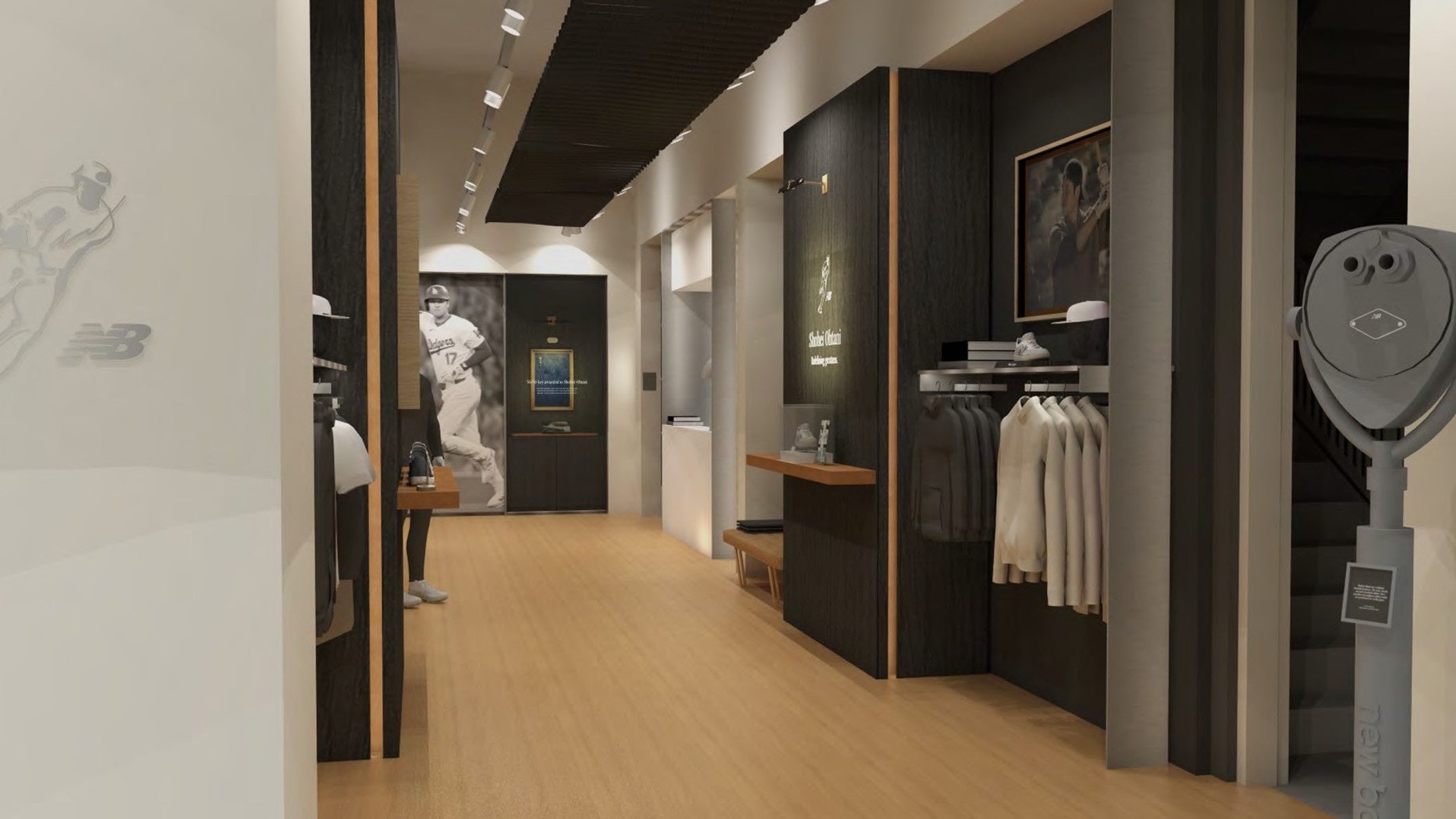 エントランスを入るとそこはスポーツやカルチャーイベントなどをフレキシブルに表現するダイナミックなステージが登場します。ニューバランスの最新のアイテムやコレクションが展開されていきます。そしてエスカレーターを挟んだ反対側には、ニューバランス契約アスリートである大谷翔平選手のシグネチャーコレクション「The Ohtani Signature Collection」を展開し、プロダクトだけでなくシグネチャーロゴデザインの背景を知ることができる展示エリアや、大谷翔平選手直筆のサイン入りアイテムの展示も行います。