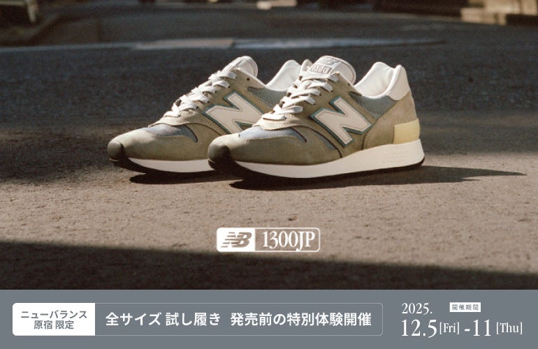 今年、2025年5月に発売されたニューバランスを代表するモデルのひとつMade in USA 1300JPが再入荷いたします。1985年にアメリカで誕生した「1300」は、当時革新的な技術とプレミアム素材でランニングシューズの常識を変え、日本でも熱狂的な支持を集めました。「1300」はその後ブランドの伝統を讃え、5年ごとに限定復刻されています。ニューバランスのアメリカの自社工場で職人の手により細部にまでこだわって生産されるMade in USAの「1300」は、スニーカーファンを魅了し続けているモデルの一つです。このたびニューバランス原宿にて12月12日(金)に抽選販売を実施いたします(事前にウェブ上にて抽選、ニューバランス原宿にてお受け取り)。販売に先駆け、12月5日(金)より全サイズの試し履きシューズをご用意いたします。