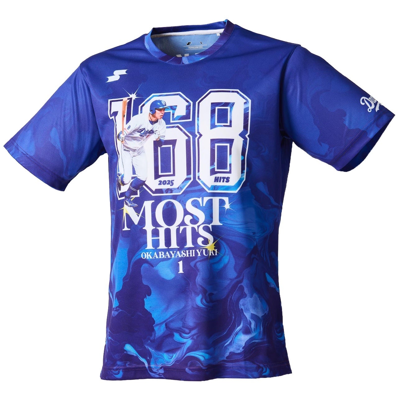 本記念Tシャツは、中日ドラゴンズをイメージした鮮やかなブルーのマーブル柄で、チームカラーの力強さとスピード感を表現しました。胸元には「168 HITS」と岡林選手の力強い打撃動作を配置。中央に“MOST HITS”、名前と背番号「1」をデザインし、左袖には球団ロゴをレイアウト。背面にも背番号とネームをプリント、シーズンの感動と選手たちの努力を、いつでも手元に感じられるSSKオリジナル記念Tシャツ。観戦にもコレクションにも最適な特別な1枚です。