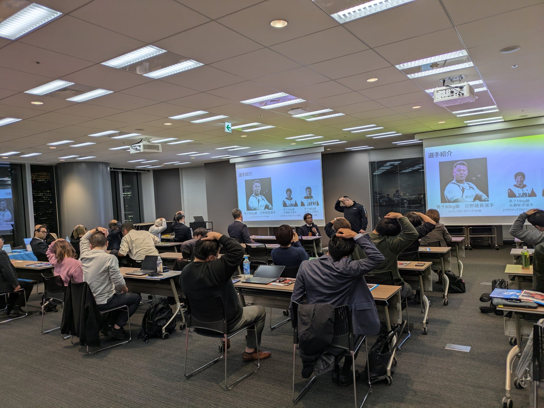 まずは、選手を派遣しての、専門性に基づいた新しい健康経営プログラムとして即座に導入いただけるご提案例として、全日本チャンピオン・日野雄貴選手(男子80Kg級)が講師として立ち、デスクワーク回復術を。社員の心身の活力を即座にチャージする内容を、ご要望に合わせてカスタマイズしご提案が可能です。