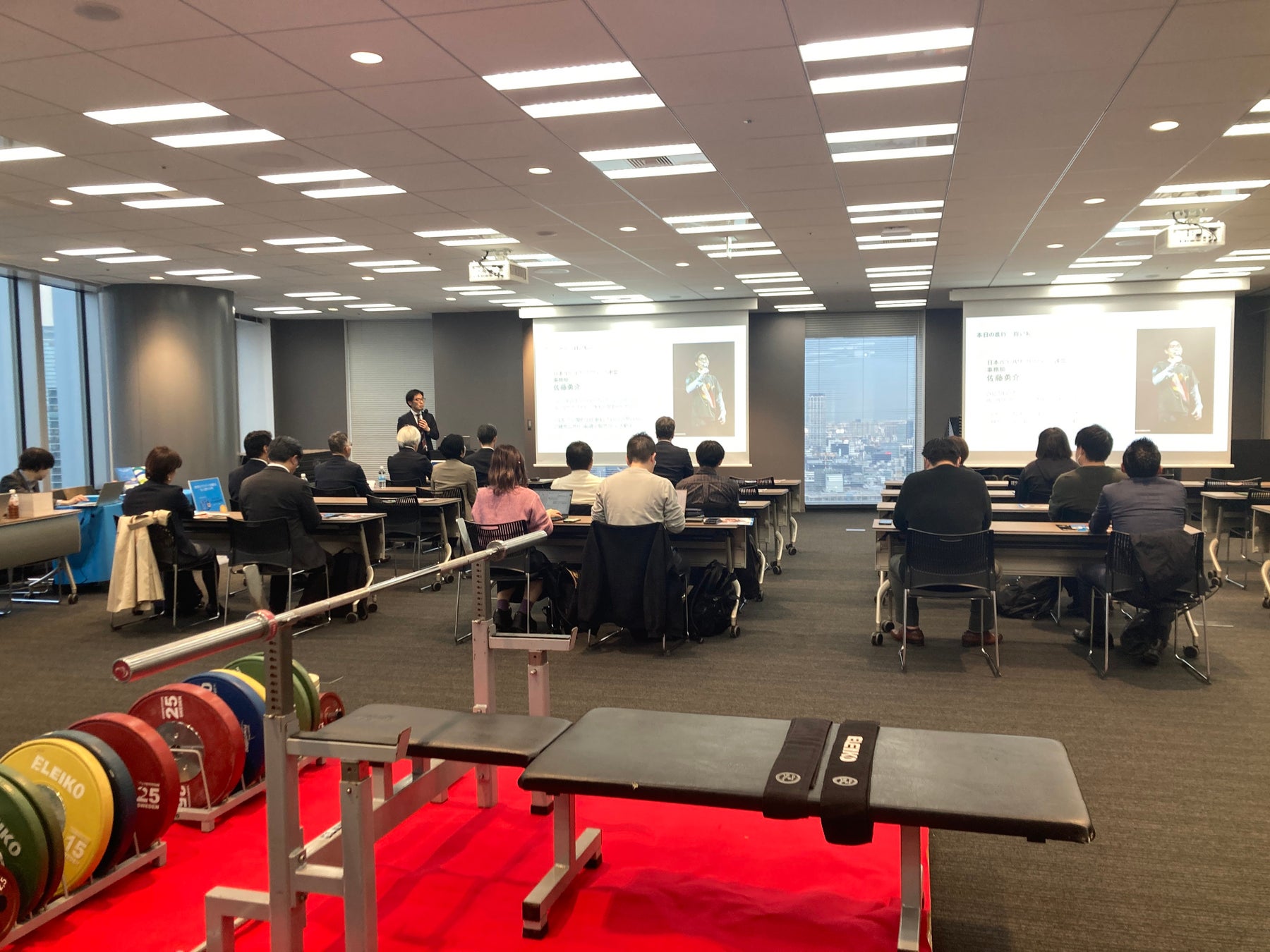 前半はスライド投影による講演形式でパラ・パワーリフティング活用をされている3社様からの事例紹介と、パラ・パワーリフティング連盟からのご提案ということで、パラ・パワーリフティングの唯一無二性を活用した体験会の意義、科学的根拠、効能など、ご紹介させていただきました。