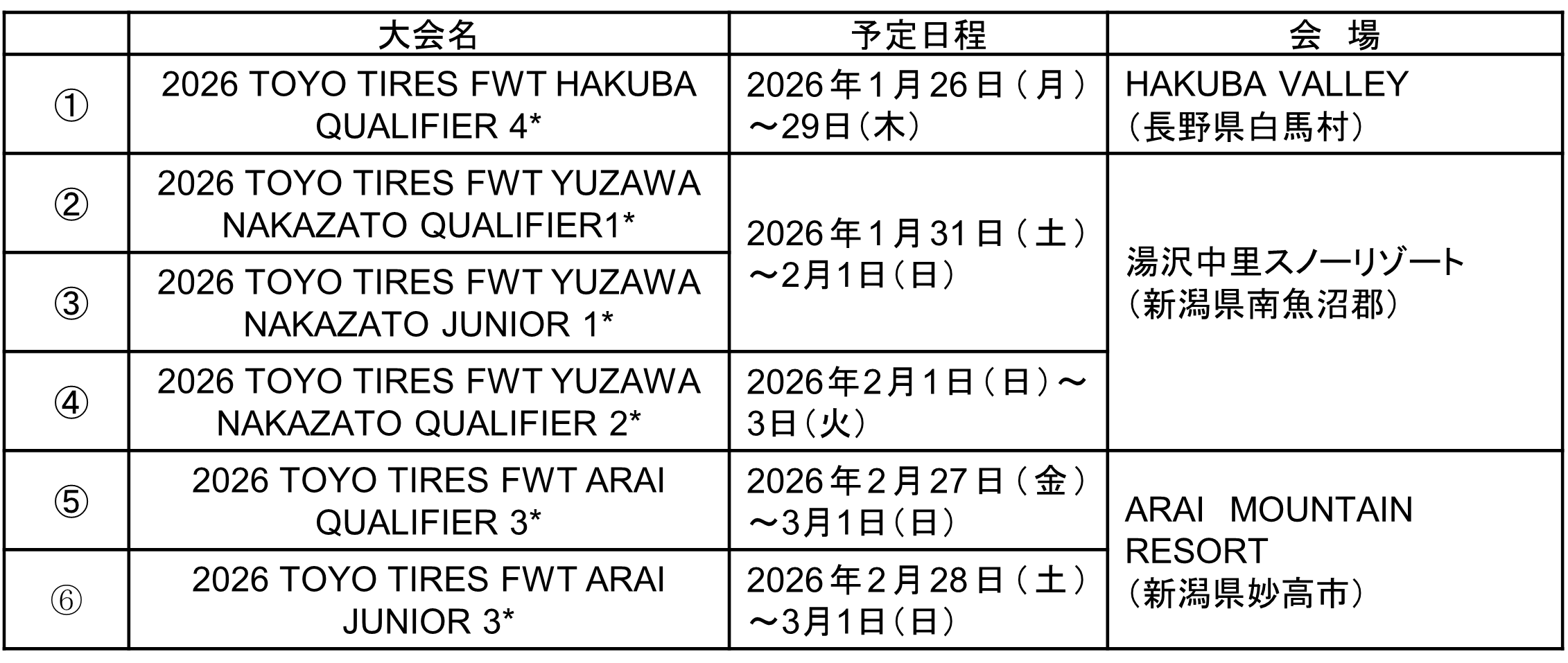 ● 各大会は会場となるスキー場が主催します。①2026 TOYO TIRES FWT HAKUBA QUALIFIER 4*大会のみ、