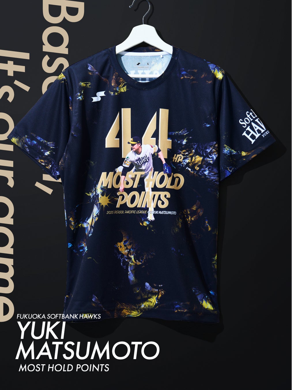 本記念Tシャツは、福岡ソフトバンクホークスをイメージした躍動する“鷹”をデザインし、胸元にはタイトル獲得を象徴する 「44 HP」 をゴールドで配置。その前面には、松本裕樹選手の力強い投球動作をレイアウト。中央には “MOST HOLD POINTS” のタイトルロゴ、そしてパリーグの名称と「#66 YUKI MATSUMOTO」を記載し、左袖には福岡ソフトバンクホークスのロゴが入り、タイトル獲得を球団と共に祝福。