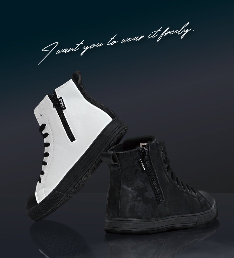サイドファスナー仕様で快適な脱ぎ履きを実現し、先芯を覆うゴムキャップがタフな印象を引き立てます。