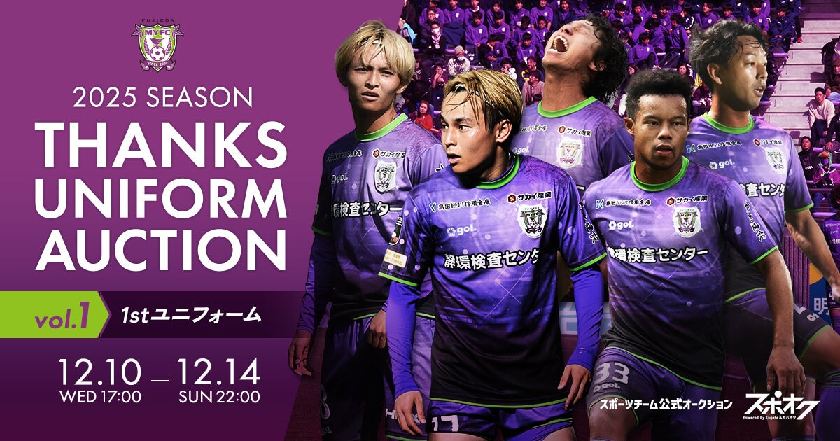 株式会社モバオク(本社:東京都渋谷区、代表取締役社長:小一原 宏樹、以下モバオク)がエンゲート株式会社(本社:東京都中央区、代表取締役:城⼾ 幸⼀郎、以下エンゲート)と業務提携し提供するスポーツチーム公式オークションサービス「スポオク」にて、J.LEAGUE所属の藤枝MYFCは『藤枝MYFC 2025 SEASON THANKS UNIFORM AUCTION Vol.1』を2025年12月10日(水)から開始します。