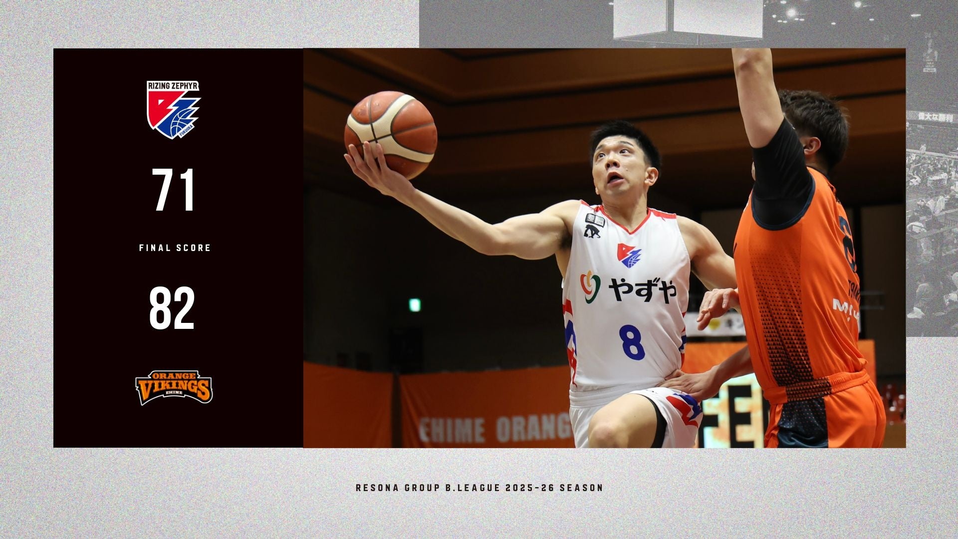 2025年12月10日(水)に開催した、りそなグループ B.LEAGUE 2025-26 シーズン【ライジングゼファーフクオカ vs.愛媛オレンジバイキングス】戦は、“福岡 71-82 愛媛”で福岡の敗戦となりました。