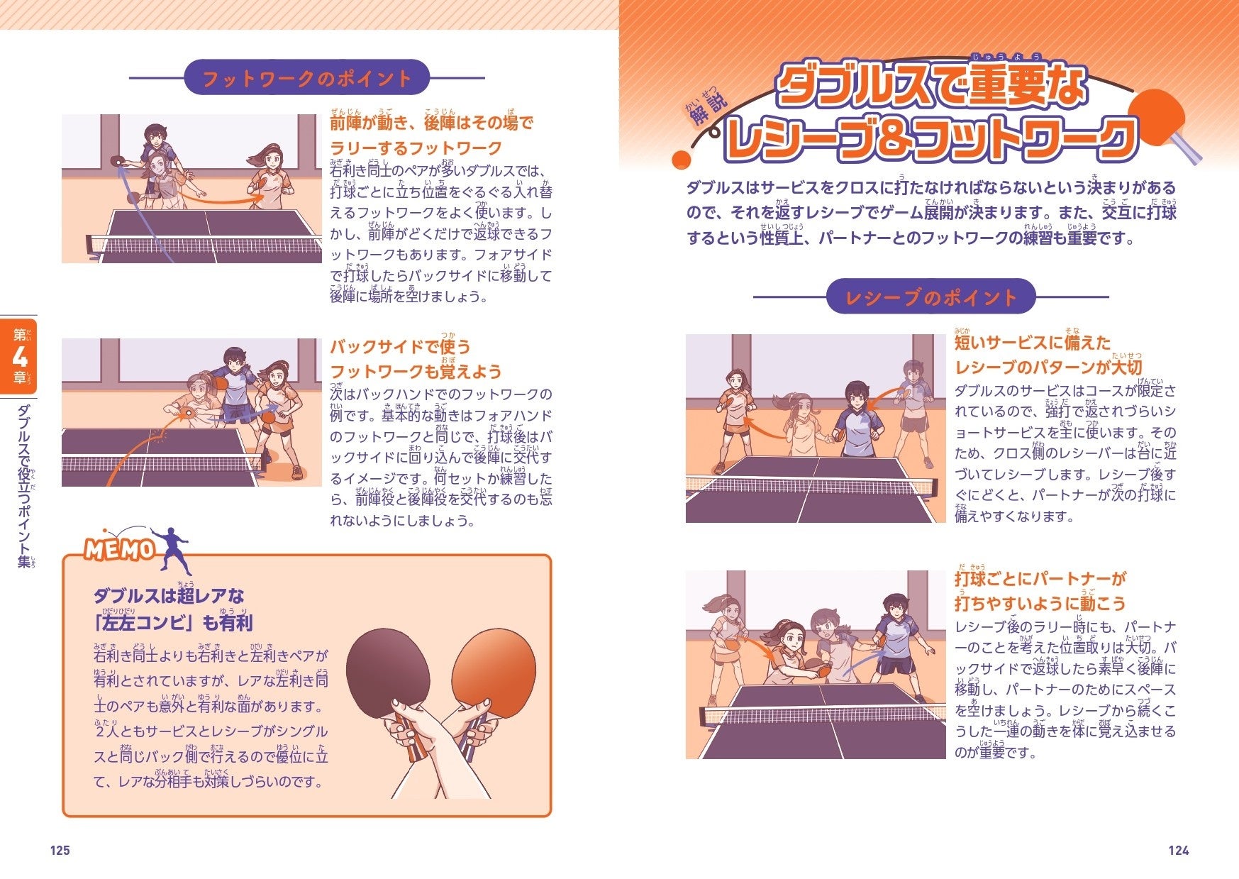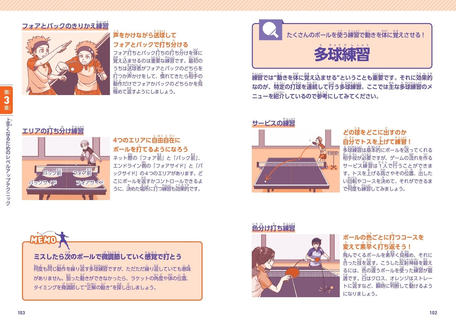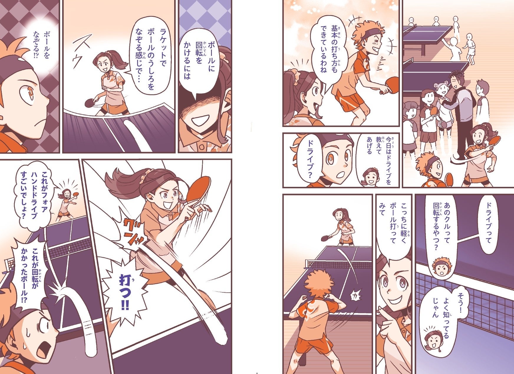 卓球クラブに入部した主人公たちが、練習を重ねて成長していくストーリー仕立て。体の動きや道具の使い方もマンガで視覚的に理解できるので、初心者でも楽しく読み進められます。