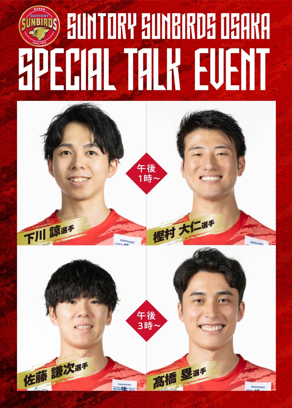 午後1時台に下川 諒選手と樫村 大仁選手、午後3時台に佐藤 謙次選手と髙橋 塁選手が登場し、今シーズンのサンバーズについてトーク。人気グッズが当たる抽選会も開催予定。