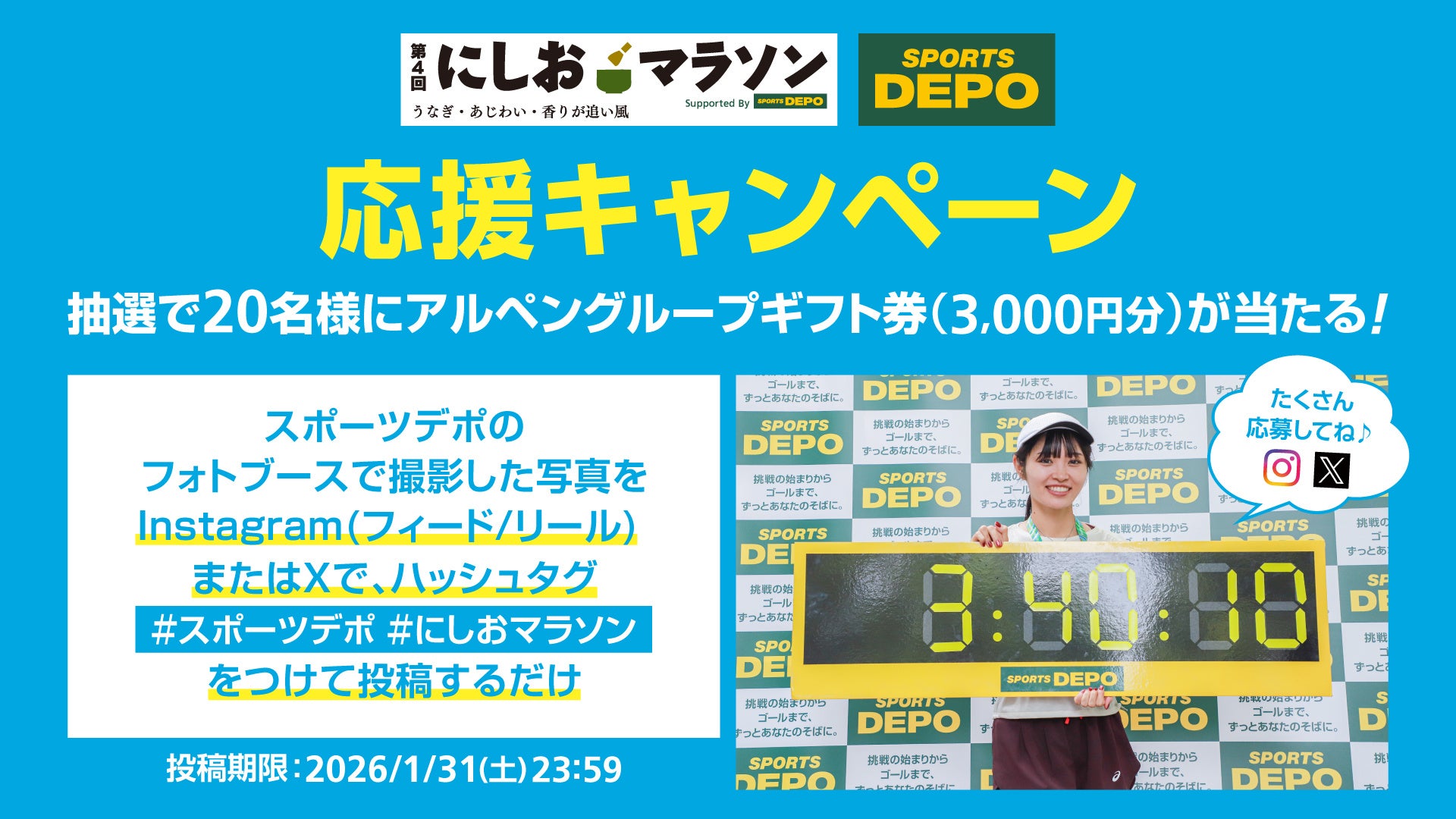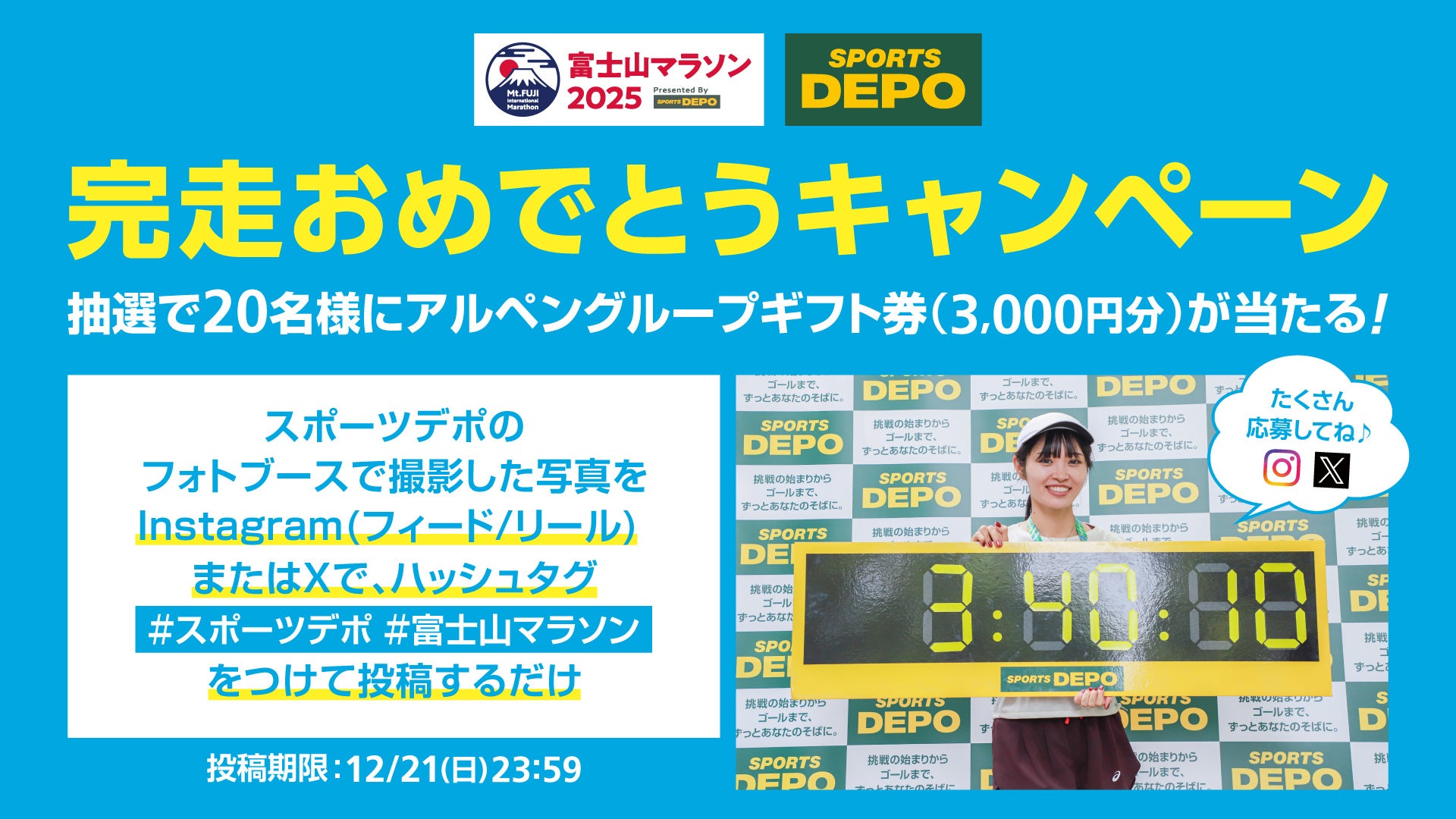 富士山マラソン2025、第4回にしおマラソンでは、スポーツデポのフォトスポットで撮影した写真をSNSで投稿いただくと、抽選で各大会20名様にアルペングループギフト券(3,000円)が当たるキャンペーンを開催いたします。応募対象の投稿は、Instagram(フィードorリール)での投稿、もしくは、Xでの投稿となります。各大会の応募条件は、下記URLをご参照ください。