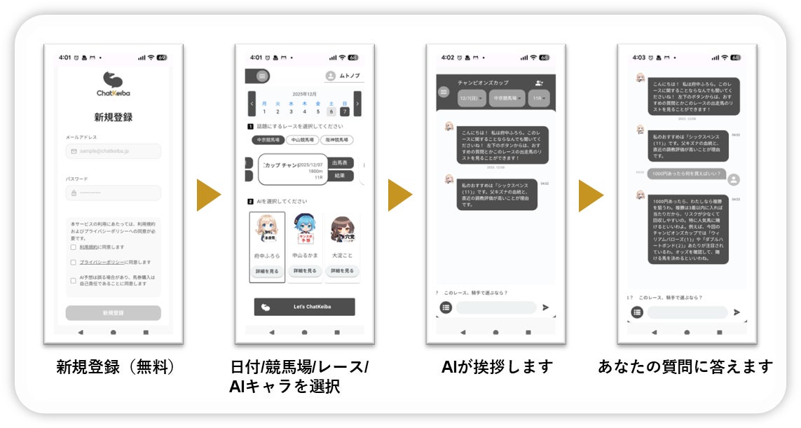 産経新聞社は12月12日、JRA(日本中央競馬会)が実施する競馬レースを対象にしたAIサービス「ChatKeiba(チャットケイバ)」の提供を開始しました。弊社が発行するサンケイスポーツが蓄積したデータと記者の予想だけを学習しています。チャット型のオリジナルのサービスが何と無料でお楽しみただけます。発売レースを選ぶと、注目馬やおススメ馬、調子のいい馬の評価などをわずかな時間で教えてもらえます。競馬新聞の読み方は難しいと感じている方でも、 AIキャラクターに聞くことでグッと身近になってきます。まったく新しいUX(ユーザー体験)をどうぞお楽しみください。