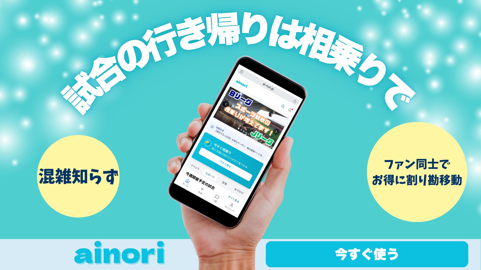ainoriは、同じ試合に向かう人同士がタクシーを「割り勘で相乗り」して移動できるWebサービスです。アプリインストール不要のため、手軽に利用を開始できます。