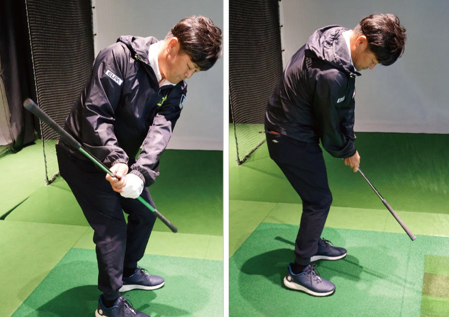 樹脂シャフト側のグリップを持ち、インパクト前で手を止めるとヘッドが加速。 プロはシャフトを活かして飛距離を伸ばします。 スチールシャフト側で速いスイングを練習し、スピード感を養いましょう。 1日5~10回スイングがおすすめです。