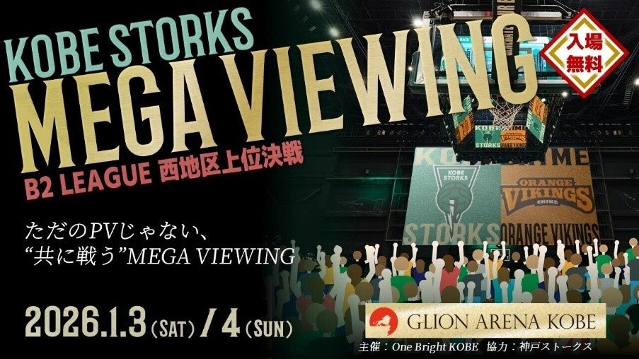 新年初戦のB.LEAGUE「神戸ストークス vs 愛媛オレンジバイキングス」のライブビューイングの同時開催が決定!試合を見たことがある人もない人も楽しめる、ホーム戦さながらの演出と一緒に白熱の試合観戦をお楽しみいただけます。