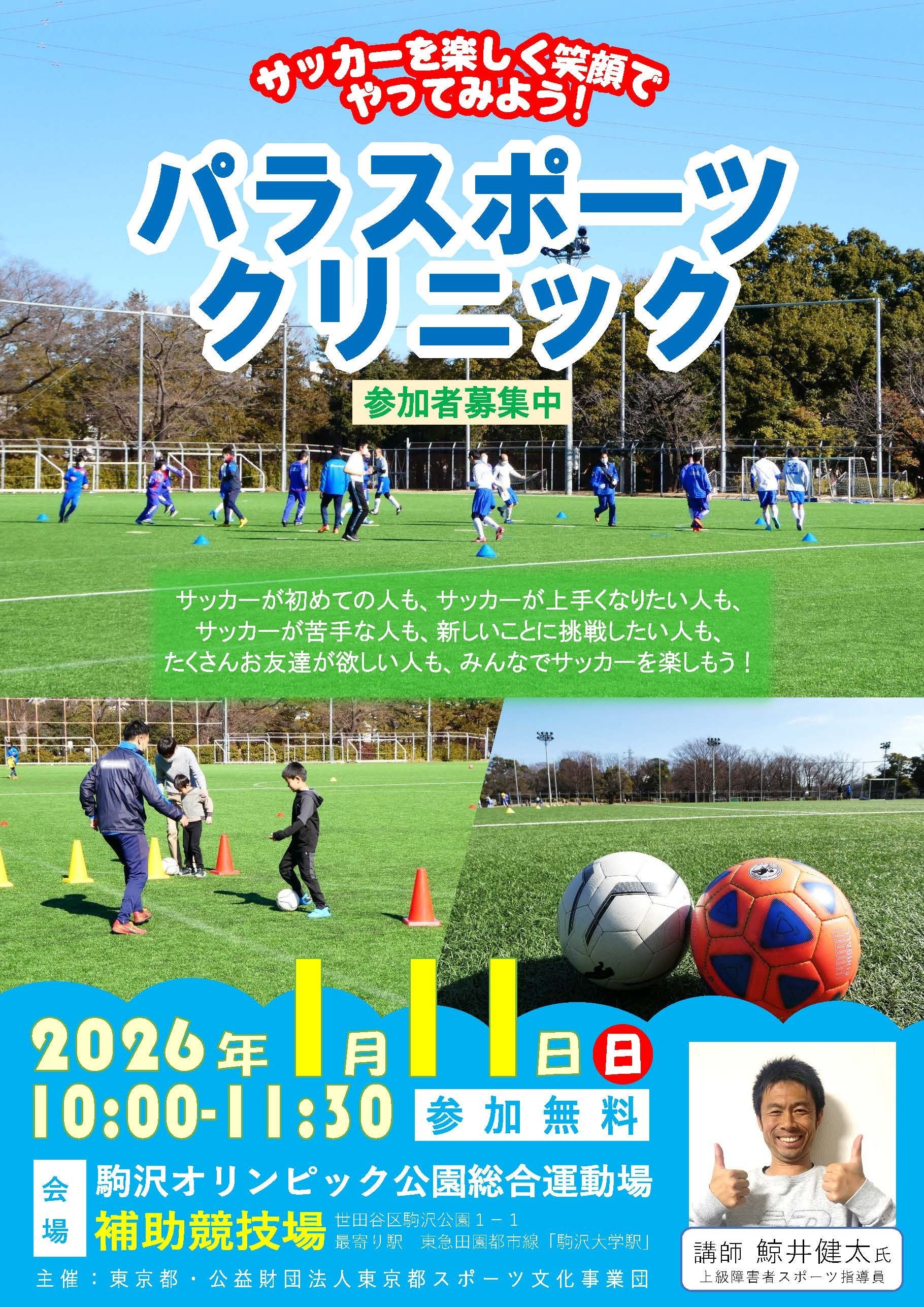 「スポーツで創る、東京の未来」をスローガンに、「スポーツフィールド・東京」の牽引役として様々な事業を展開する公益財団法人 東京都スポーツ文化事業団(渋谷区・千駄ヶ谷)は、「東京 2025 デフリンピック」の競技会場となった駒沢オリンピック公園総合運動場で2026年1月10日(土)にブラインドラグビーの体験ができる「パラスポーツシンポジウム(ブラインドラグビー)」、2026年1月11日(日)に障害のある方を対象としたサッカー教室「パラスポーツクリニック(サッカー)」を開催いたします。