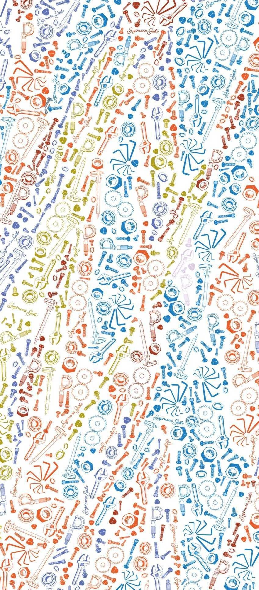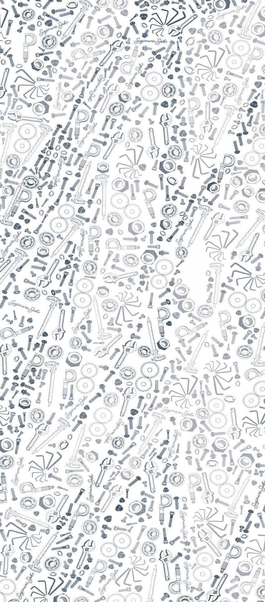製造業といえばコレ!というアイテムを社員にヒアリングし、歯車/ねじ/ボルト/ノギス/マイクロメータ/六角レンチなど、“ものづくり”を象徴するアイテムを螺旋状にデザインしました。