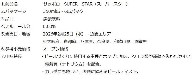 サッポロビール株式会社(本社:東京都渋谷区、代表取締役社長:時松浩、以下サッポロビール)は、ミズノ株式会社(本社:大阪府大阪市、代表取締役社長:水野明人、以下ミズノ)との協働開発による新たなノンアルコールビール「サッポロSUPER STAR(スーパースター)」を近畿エリア限定(注1)で2026年2月25日(水)に通年発売します。