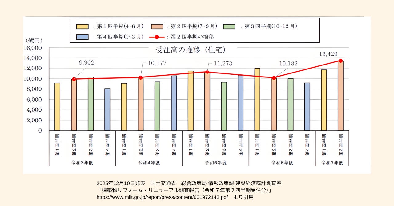 「建築物リフォーム・リニューアル調査報告(令和7年第2四半期受注分)」から、令和7年度第2四半期の受注高の合計は、4 兆 5,495 億円、そのうち、住宅に係る工事の受注高は 1 兆 3,429 億円で、同 32.5%増加したことが分かりました。