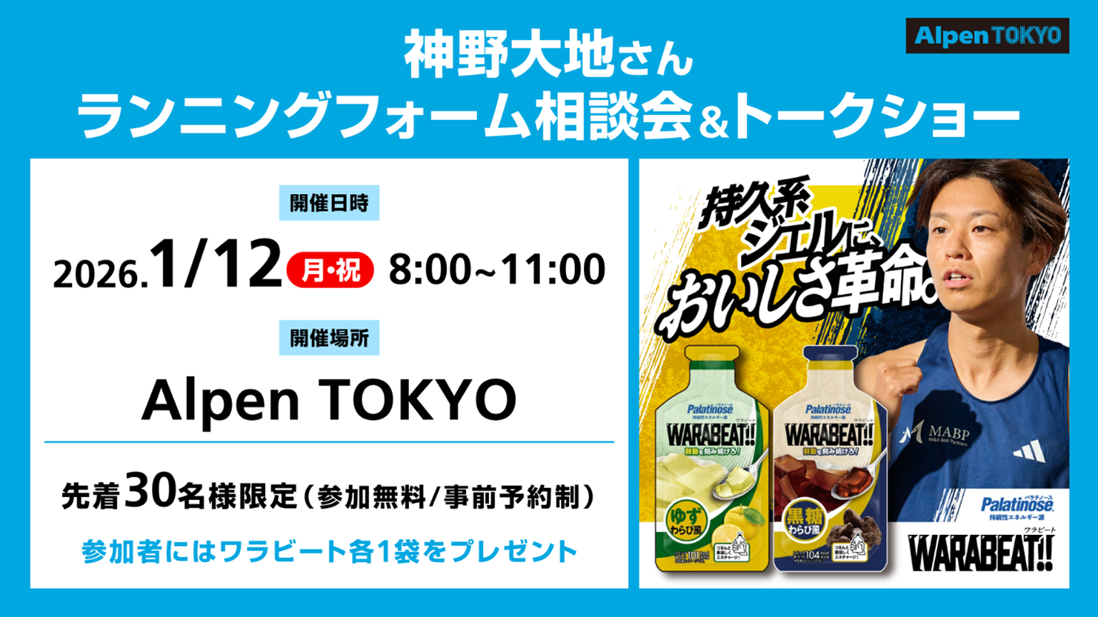 イベントでは、参加者に「WARABEAT!!」を配布し、実際のランニングシーンでの補給体験を提供。トークショーでは、ニューイヤー駅伝・箱根駅伝の振り返りや実戦での補給戦略、持久系スポーツにおける「パラチノース®」の活用について神野さんが語ります。