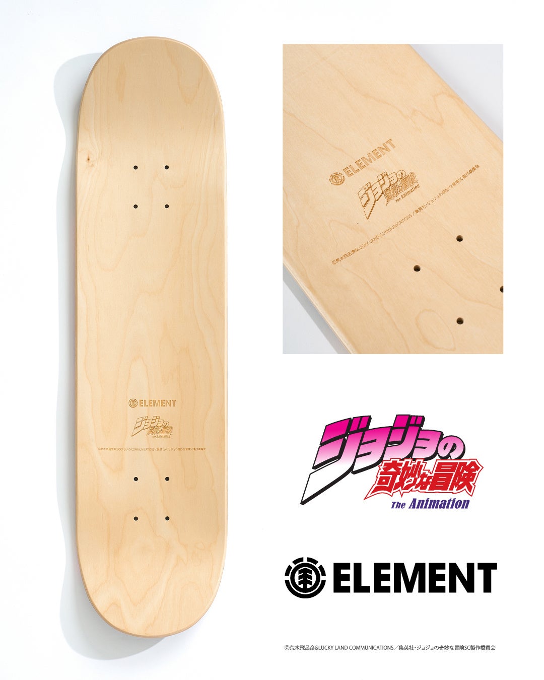 アニメ「ジョジョの奇妙な冒険」第3部「スターダストクルセイダース」の世界観を、世界的なスケートボードブランド ELEMENT SKATEBOARDS の高品質なスケートボードに落とし込んだ限定デッキは全8種。価格は各1万4960円(税込)。