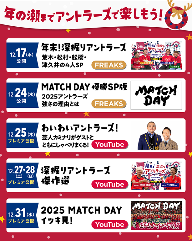 アントラーズ公式SNS、有料会員制サイト「FREAKS」は、年末も盛りだくさんのコンテンツラインナップをご用意しています!