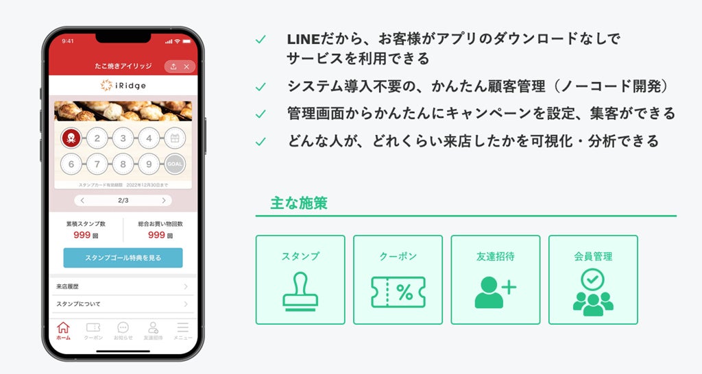 自社でポイントシステムを導入することなく単体でCRM(顧客関係管理)や来店分析、集客施策を行えるLINEミニアプリの販促ツールで、月額5万円から利用可能です。店舗集客のきっかけとなるクーポンやスタンプカードに加え、会員登録機能や友達紹介機能などを搭載しています。クーポンやスタンプの利用状況、登録した属性情報などのデータをもとにセグメントを作成し、特定顧客限定クーポンや期間限定クーポン、枚数限定先着クーポンなどの発行も可能です。