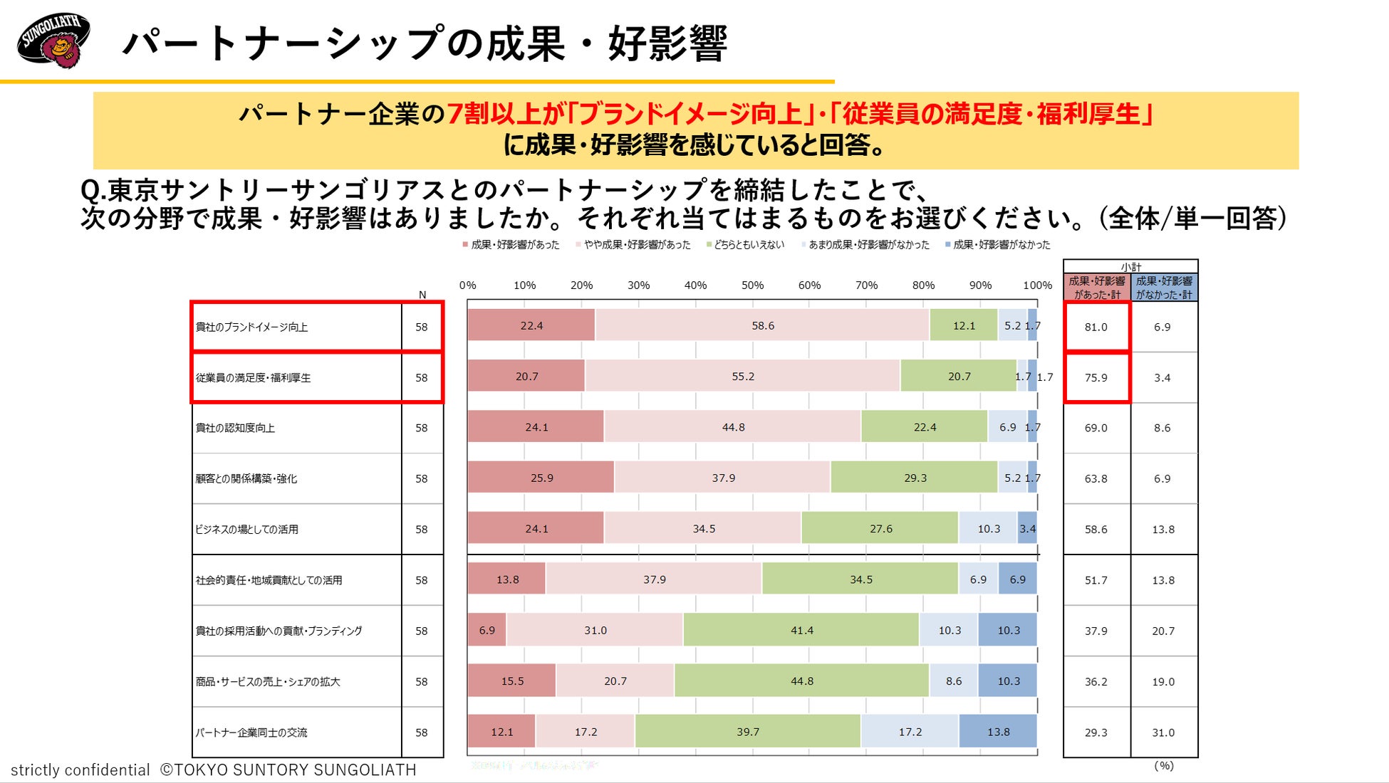 東京サントリーサンゴリアスのパートナー企業さまより、サンゴリアスとのパートナーシップを通じて、「認知度・ブランドイメージ向上」「売上・シェアの拡大」「顧客との関係構築・強化」「従業員の満足度・福利厚生」「採用活動」「地域貢献」に成果・好影響があったとのお声をいただきました。