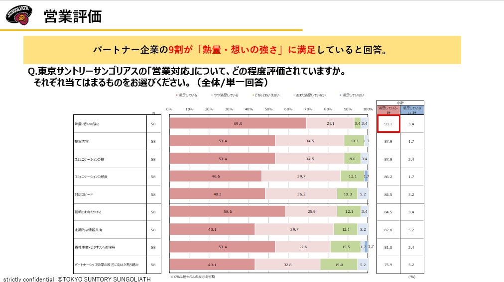 東京サントリーサンゴリアス(サントリーホールディングス(株)スポーツ事業部)は、パートナーシップの取り組みを通じて得られた成果や価値を明らかにするため、東京サントリーサンゴリアスパートナー企業の皆様に対して、満足度調査を実施いたしました。