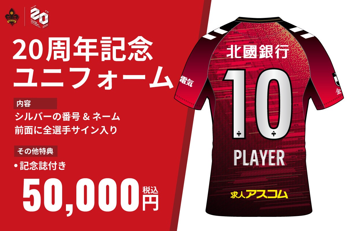 20周年ユニフォームと同じゴールドワッペンを使用したhummelコラボポロシャツと、20周年ユニフォームのデザインを踏襲したhummelコラボタオルマフラー、さらに記念誌付き。