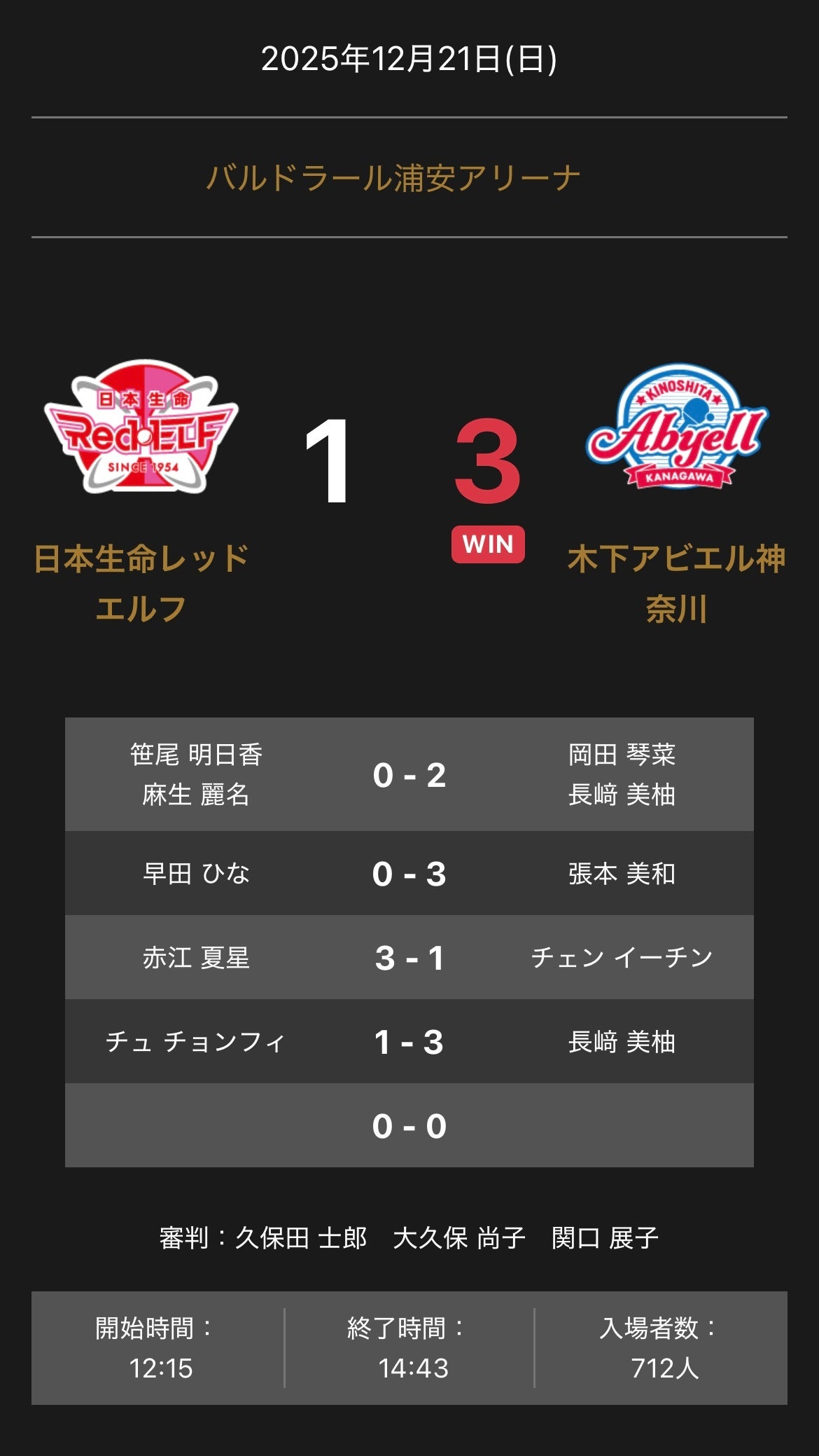 ホームプレスリリース ノジマTリーグ 2025-2026シーズン 公式戦 12月21日開催 日本生命レッドエルフ vs 木下アビエル神奈川 試合結果 2025年12月21日 15時50分 公開|スポーツマニア編集部プレスリリース 一般社団法人Tリーグのプレスリリース ノジマTリーグ 2025-2026シーズン 公式戦 12月21日開催 「日本生命レッドエルフ vs 木下アビエル神奈川」の試合は、3-1で木下アビエル神奈川が勝利しました。