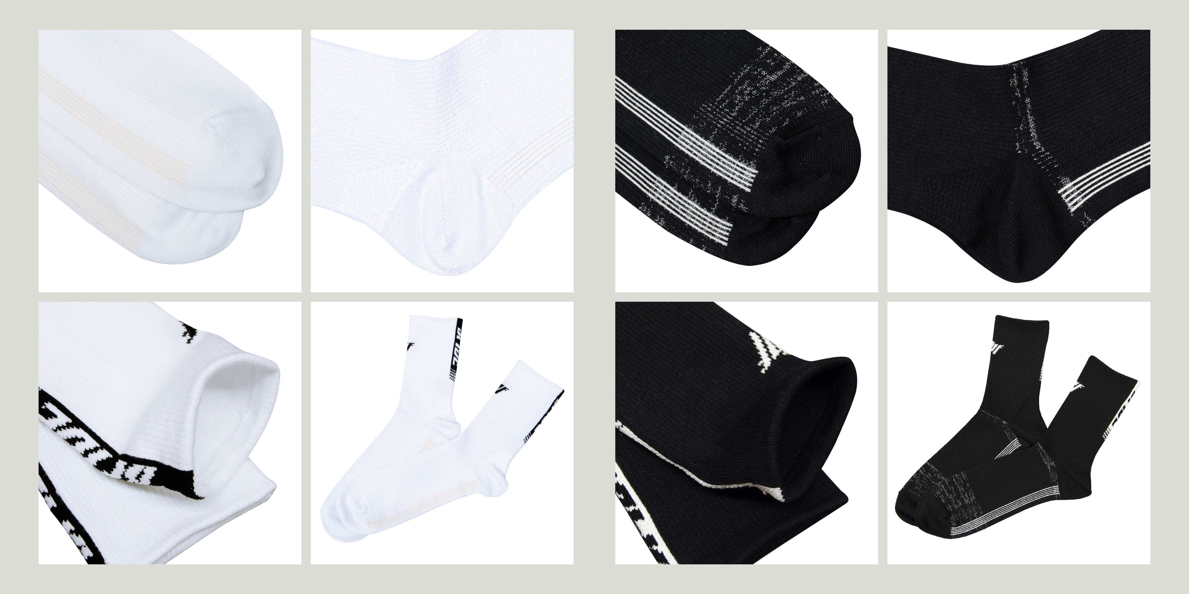 カラーは、ブラックとホワイトのシンプルな2色展開。ソックス背面に大胆にレイアウトした縦ロゴが、スポーティで力強い印象を演出します。