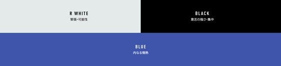 アパレルに採用しているカラーは、緊張・可能性を表現したシルバー系のRIN.ホワイト、意志の強さ・集中を表現したブラック、内なる情熱を表現したブルーの3色です。全てが動き出す直前の緊張感と集中の瞬間を表現しています。