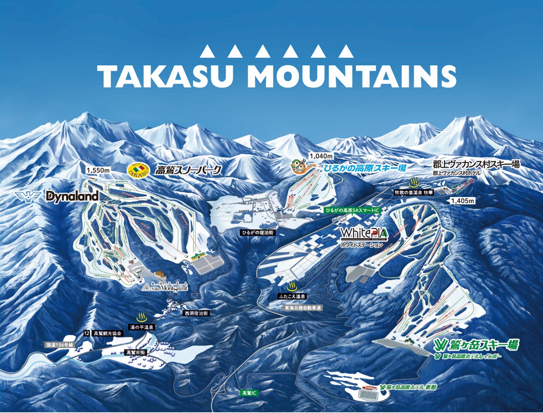 TAKASU MOUNTAINSとは、ダイナランド、高鷲スノーパーク、ひるがの高原スキー場、ヴァカンス村スキー場、ホワイトピアたかす、鷲ヶ岳スキー場の6つのスキー場から構成されるリゾートエリアの総称です。スキー場を中心に地域一体で受入環境整備やリゾート形成に取り組んでいくことを目的に協同組合高鷲観光協会と共に立ち上げました。2024-2025シーズンの来場者数は85万人を超え、郡上市内のスキー場来場者数の7割を占めます。東海北陸自動車道「高鷲IC」「ひるがの高原SAスマートIC」からのアクセスが良くマイカー利用がメインですが、近年高速バスを使って「ひるがの高原SAバス停」を利用されるお客様も多くなっています。近隣には飛騨高山や世界遺産白川郷などもあり、香港、台湾、シンガポールのお客様を中心にインバウンド来場者も増加傾向にあります。