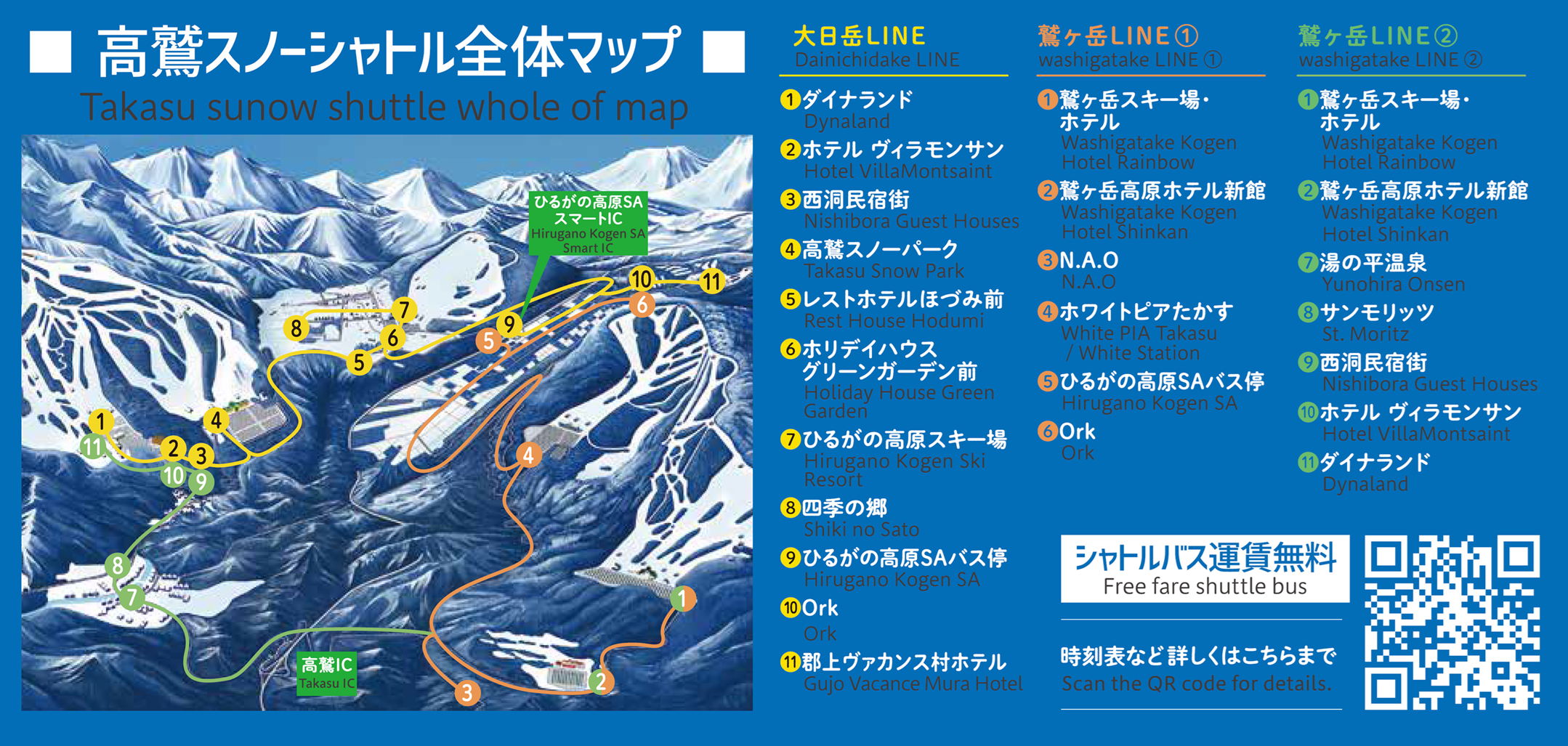 TAKASU MOUNTAINSエリア内では、冬季期間限定で無料のシャトルバスを運行しています。各スキー場と宿泊施設、温泉施設、高速バスのバス停(ひるがのSA)を結んでおり、朝から夕方まで運行しています。スキー場間のご移動や、スキー場から宿泊施設へのご移動に便利です。さらに高速バス「名古屋‐白川郷線」や「岐阜‐高山」線において、ひるがの高原SAバス停から当シャトルバスへの乗り継ぎが可能になっており、近年では訪日外国人観光客の利用も増加傾向にあります。