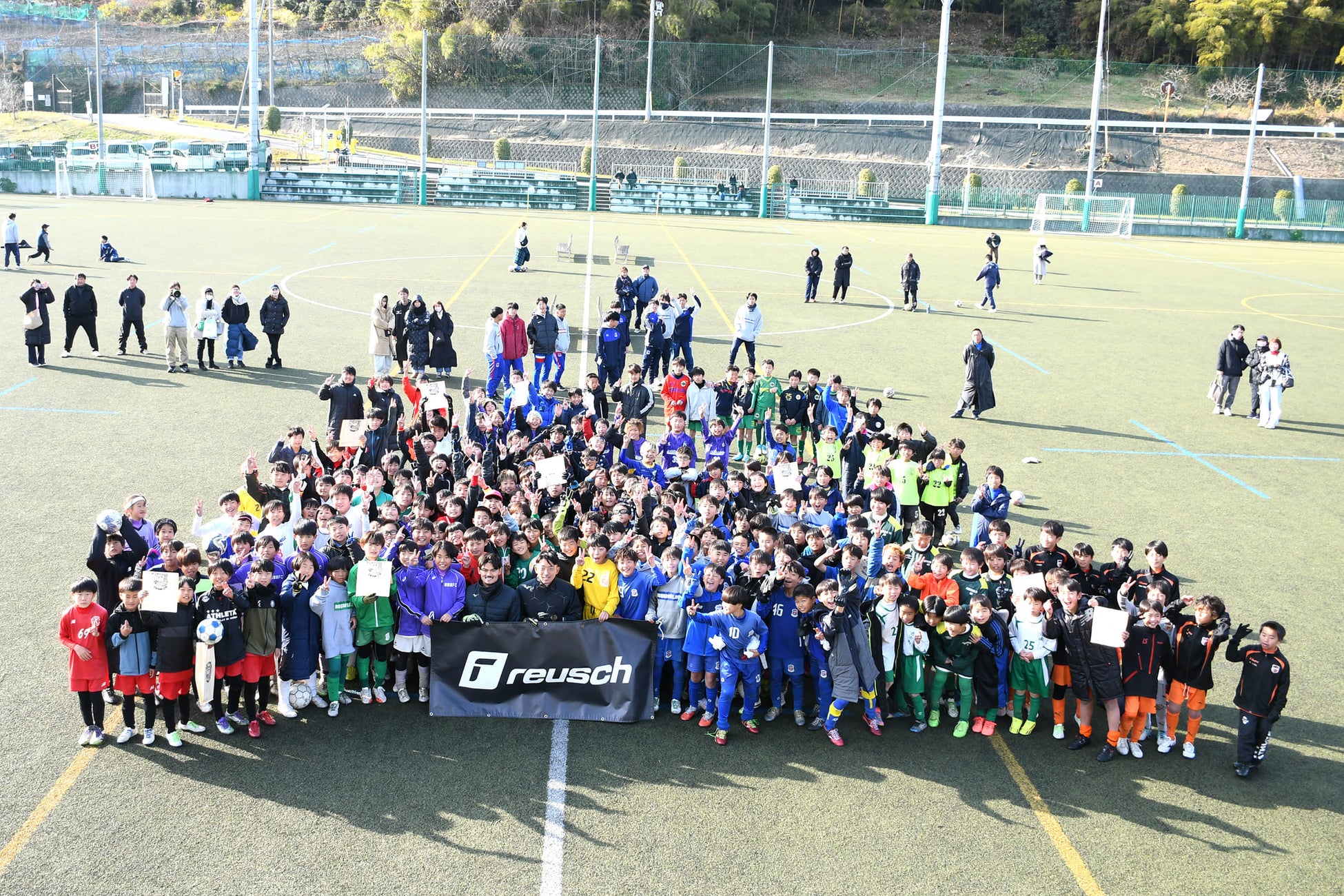 GKクリニック終了後は、コノミヤ・スペランツァ球技場に試合に来ていた小学生が全員集合。サイン入りグッズなどをプレゼントするじゃんけん大会で盛り上がりました。閉会にあたって、権田選手は、「これだけは負けないっていう自分だけの武器をつくってください」と負けない強みをつくることが日本代表にもつながると話しました。また、「ヨドコウ桜スタジアムやノエビアスタジアム神戸にJリーグの試合を見に来て、選手たちの真似をして、考えて練習をしてくれたらと思います」とアドバイスを送りました。にぎやかに行われた1日は、全員集合の記念写真を撮って、幕を下ろしました。