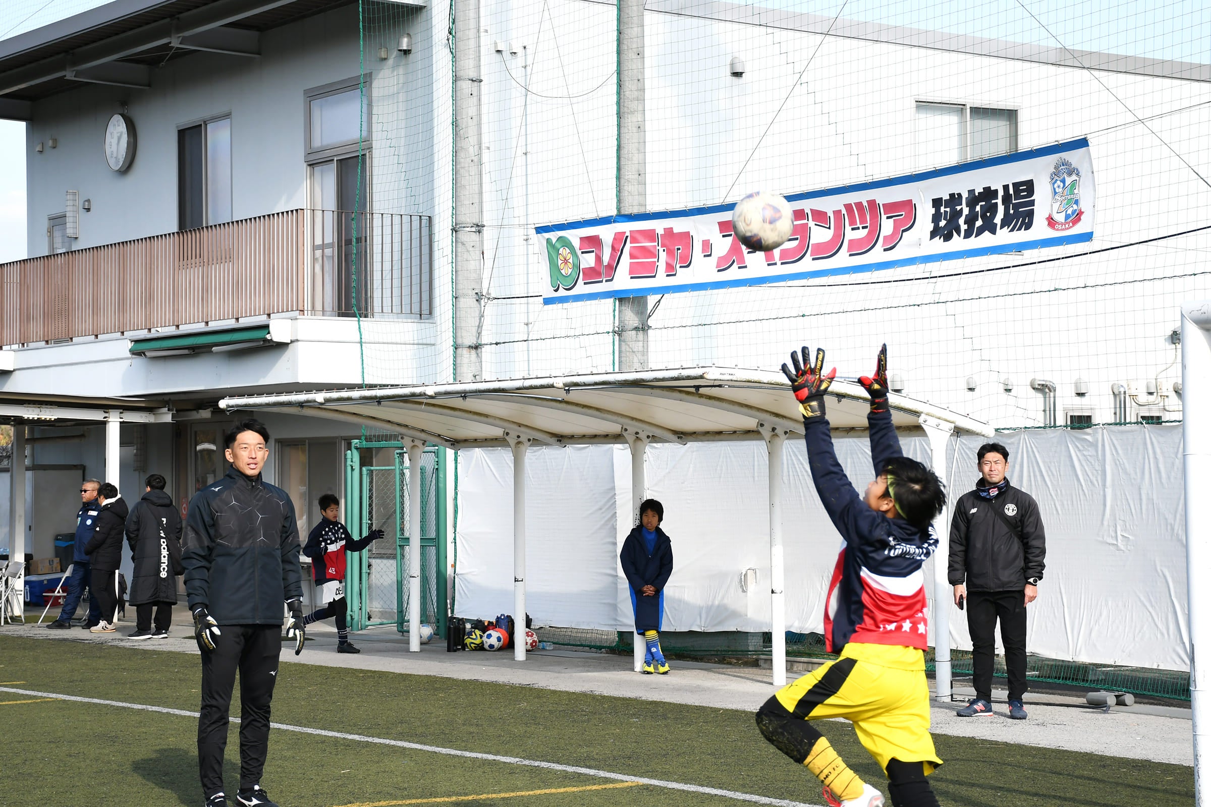 GKクリニック終了後は、コノミヤ・スペランツァ球技場に試合に来ていた小学生が全員集合。サイン入りグッズなどをプレゼントするじゃんけん大会で盛り上がりました。閉会にあたって、権田選手は、「これだけは負けないっていう自分だけの武器をつくってください」と負けない強みをつくることが日本代表にもつながると話しました。また、「ヨドコウ桜スタジアムやノエビアスタジアム神戸にJリーグの試合を見に来て、選手たちの真似をして、考えて練習をしてくれたらと思います」とアドバイスを送りました。にぎやかに行われた1日は、全員集合の記念写真を撮って、幕を下ろしました。