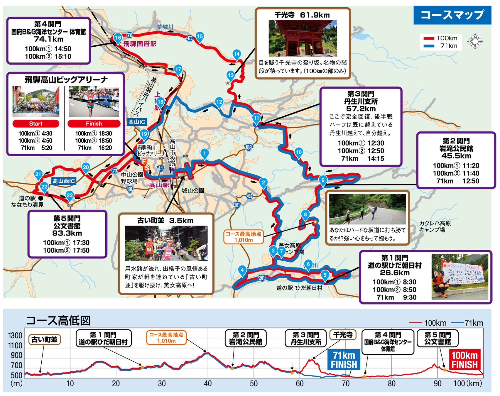 会場は例年同様、飛騨高山ビッグアリーナを拠点(スタート/フィニッシュ)とし、古い町並から久々野・朝日・丹生川・国府・清見の各地域をめぐる、現行の山岳ウルトラコースで実施します。