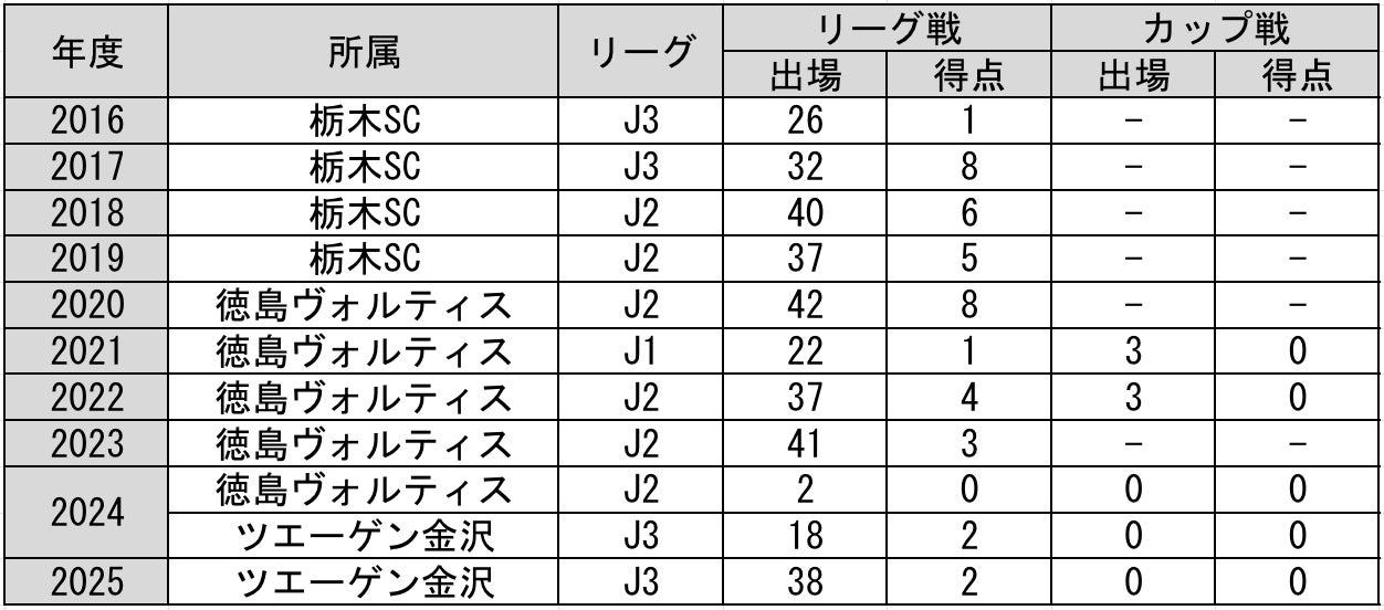 益子SCストラーダ – JEF宇都宮 – 鹿島学園高校 – 流通経済大学 – 栃木SC – 徳島ヴォルティス – ツエーゲン金沢