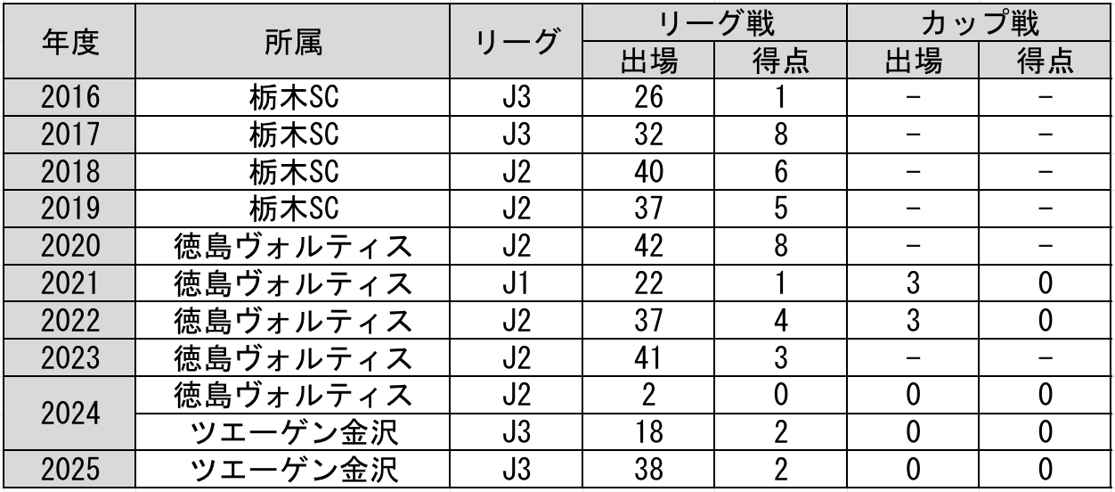益子SCストラーダ – JEF宇都宮 – 鹿島学園高校 – 流通経済大学 – 栃木SC – 徳島ヴォルティス – ツエーゲン金沢