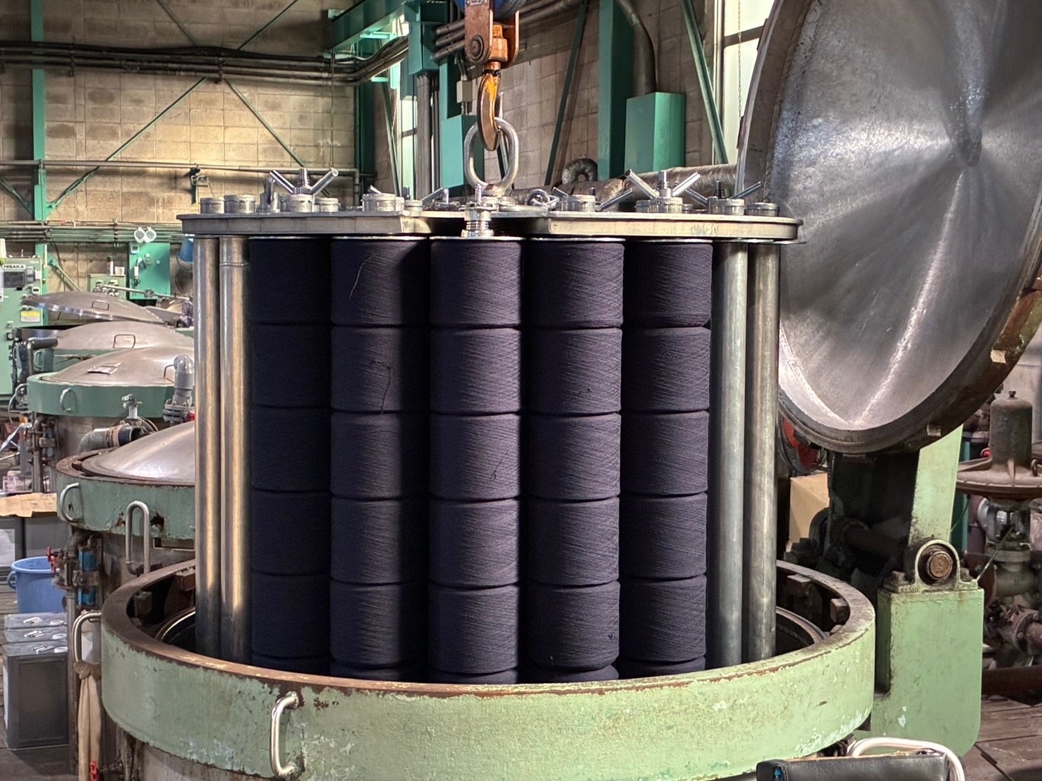 ③ スリット撚糸を藍色に染色し、織り、デニム生地へ加工する。