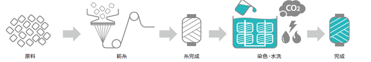 ③ スリット撚糸を藍色に染色し、織り、デニム生地へ加工する。