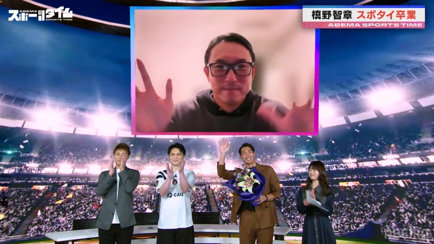 そして番組の最後には、メインコメンテーターを務める川﨑宗則さんがリモートで出演。同じくスポタイファミリーのお笑いコンビ・コットンの西村真二さんと、タレントの影山優佳さんからもメッセージが贈られ、過去の放送を思い返した槙野さんは感慨深そうな表情に。監督業に専念するため、メインコメンテーターとしての番組出演が最後となる槙野さんは、「今はワクワクしてます。毎日携帯が鳴り止まないんですよ。来季の編成とか色々やってるので、とにかく電話が鳴り止まない!」と話しつつも、「寂しいです。ここにはいつも当たり前のように来て、たくさんお話ししてたんですけど…」と放送初回から出演してきた番組への思いを吐露。「皆さん、ぜひ静岡の藤枝に遊びに来てください!」と視聴者へ向けた力強いメッセージを口にした槙野さん。柿谷さんから花束が手渡され、槙野さんの新たな門出をお祝いしました。