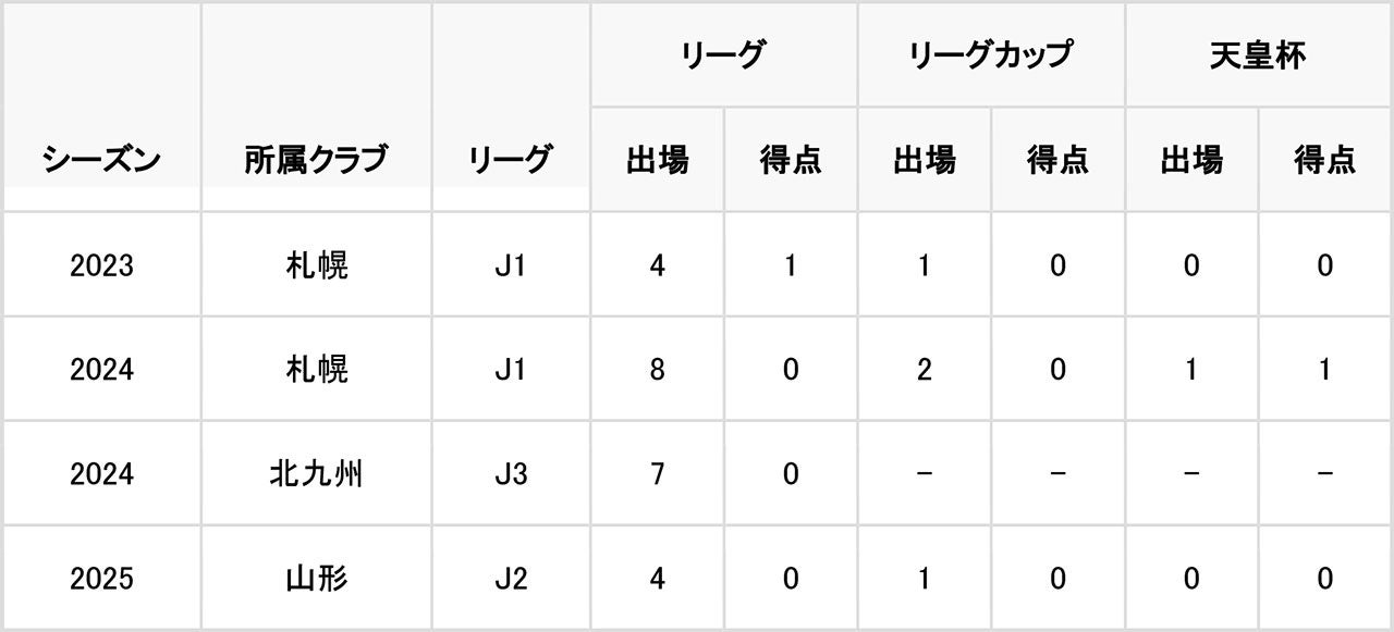 小倉南FC Jrユース – 東福岡高校 – 順天堂大 – 北海道コンサドーレ札幌 – ギラヴァンツ北九州 – モンテディオ山形